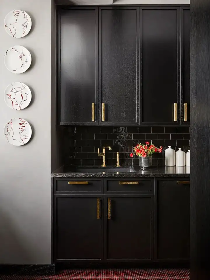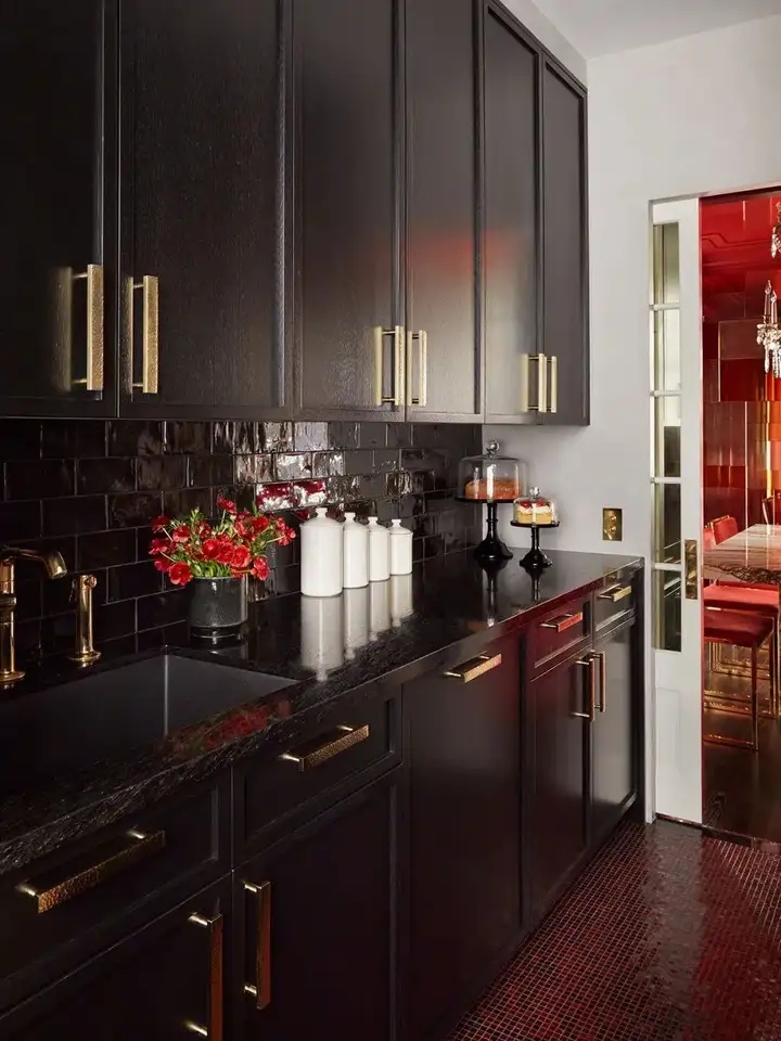 Kitchen ebony cabinets with hammered brass pulls and black hob sit on a red glass mosaic floor that complements the colour of the adjacent dining room.